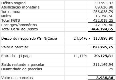 A regularização do FGTS envolveu débitos históricos entre setembro de 1983 e maio de 2013. O parcelamento, homologado sob o número 2026000803, prevê 80 parcelas, totalizando R$ 350.295,75, após negociação de um desconto de quase R$114 mil com Caixa e PGFN.